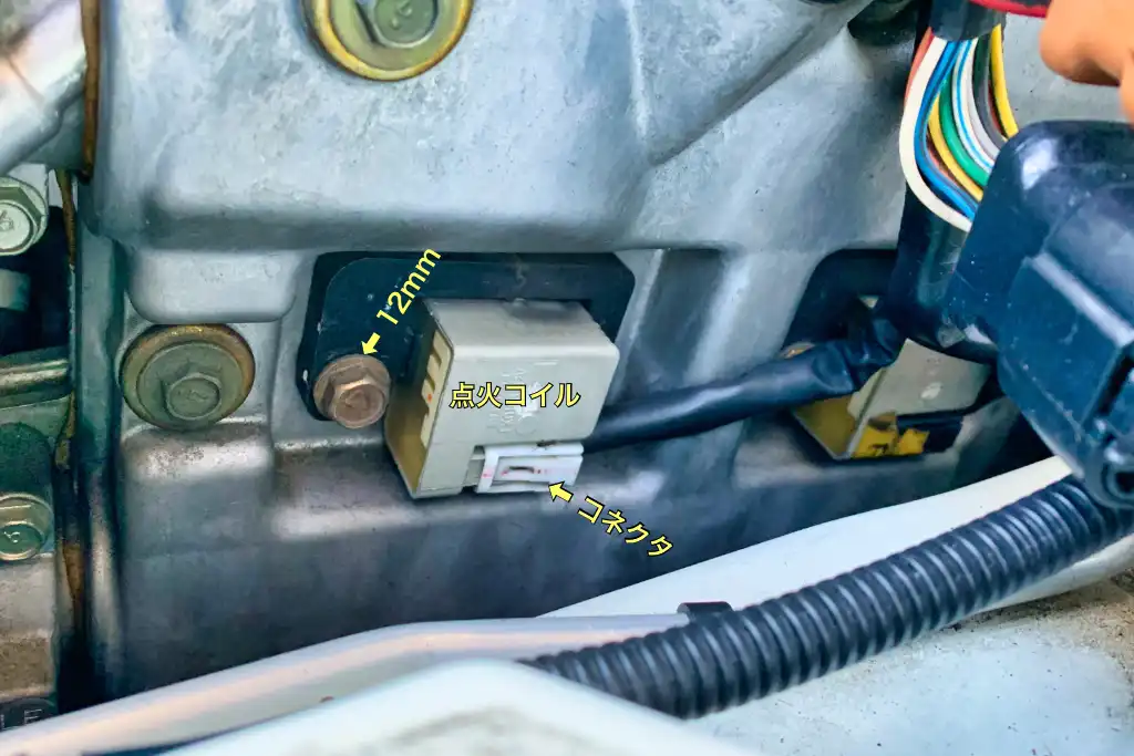 12mmのボルトを外した点火コイルを手前に引いてプラグから抜いて、点火コイルを上下反転180度回転させてプラグホールから引き抜くようにすると簡単に取り外せます.