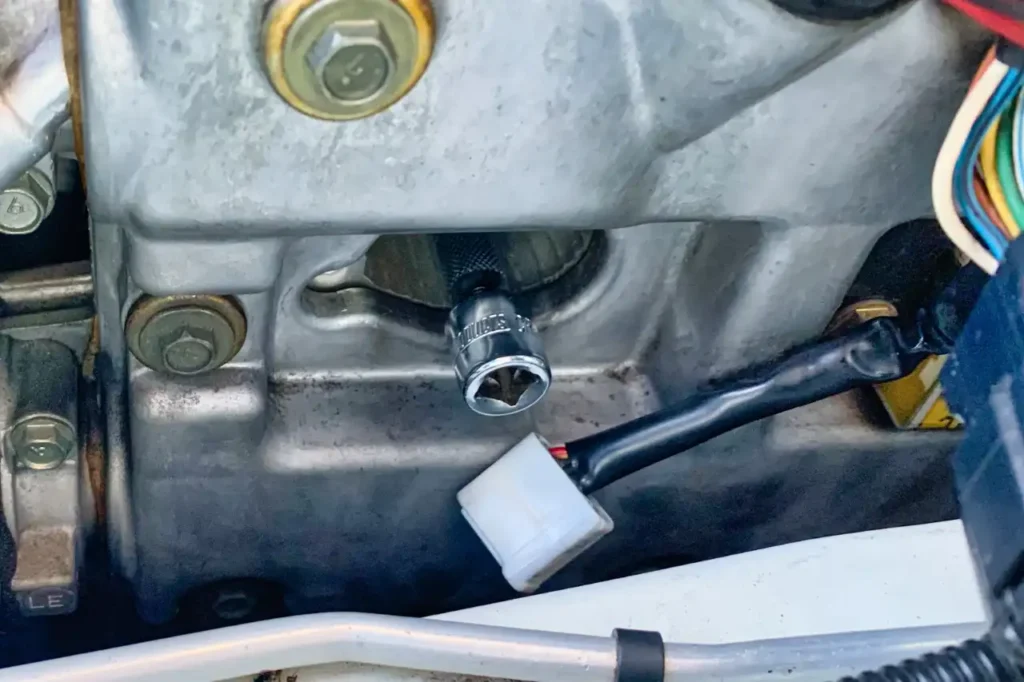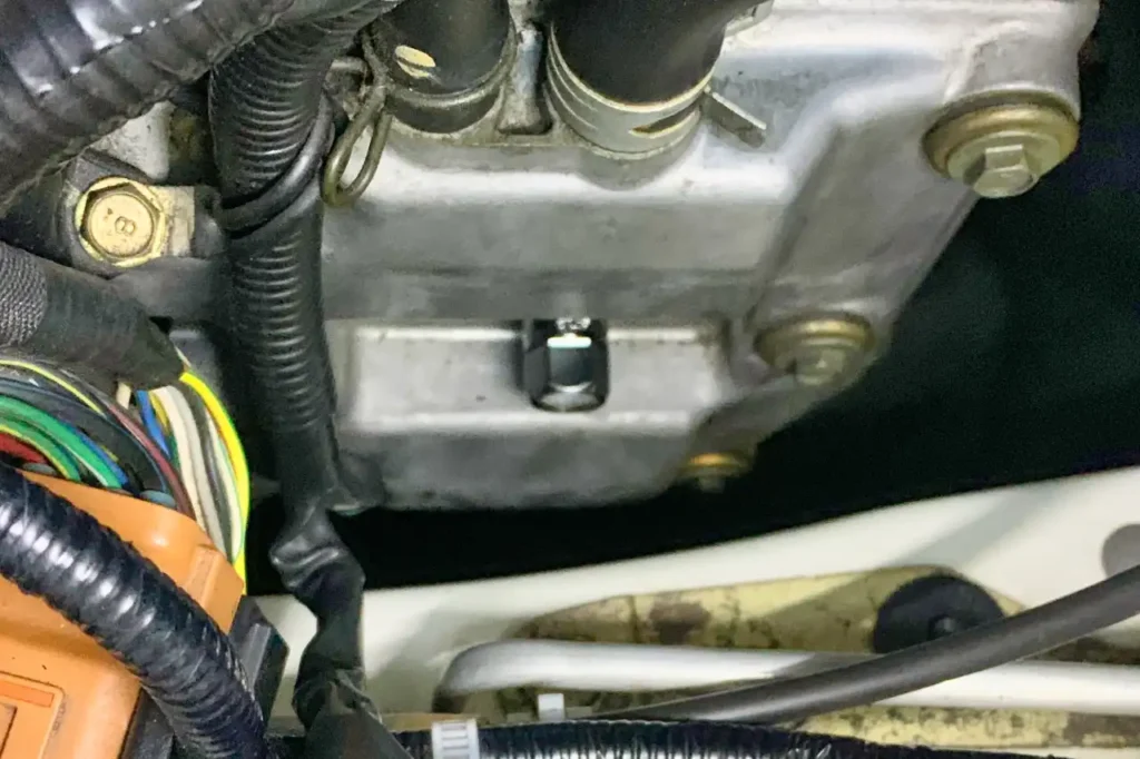 GDBのEJ20の、このボルトはコイル側に取り付けられているので、エンジンルーム内に落ちることを心配しないで外すことができる.(4箇所共通)