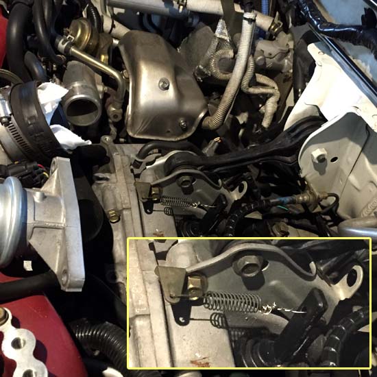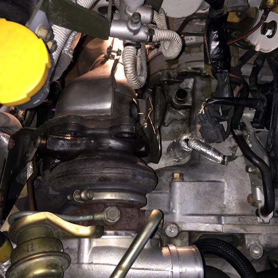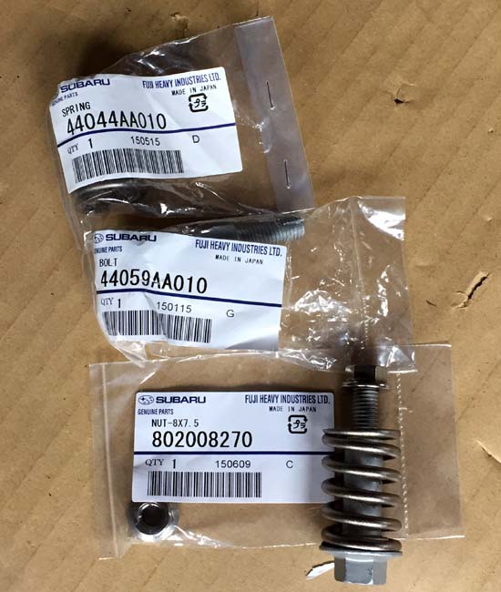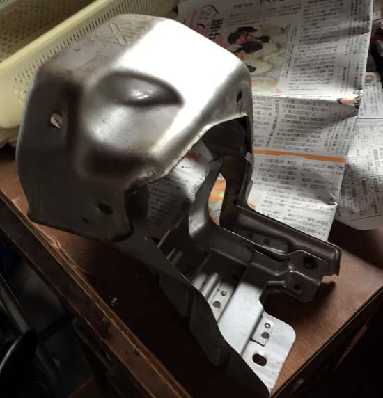 フロントパイプをサードでマフラーはAPEXのESエボリューションマフラーで排気音をAPEXのECVで制御しているのもパワーはあるし、ECVを閉じればノーマルマフラーのような静けさが手に入るのだから悪くはない。 だけど、ECVを閉じた時が、とてもストレスと違和感を感じるのだ。 静かなマフラーをワンオフで作ってみることも考えたが、よく考えると、普段のインプレッサの使い方を考えると、最高出力よりもレスポンスであったり、トルクの盛り上がりであったりするところが気持ちの良いパワーのように感じるようになってきた。 たしかに、ノーマルマフラーにすると高回転は回転するが、トルクが盛り上がらないし、タービンの回転が良くないのでトルクの盛り上がりも感じられないと記憶している。 だけど、高速道路を巡航したり、街乗りでの扱いやすさは静かでスムーズでストレスを感じなかったように思う。 ここで、インプレッサを買ってから10年の歳月が経過して、基本に立ち返ることにした。 ただ、ノーマルのマフラーに戻すと何となく野暮ったい感じが後ろから見たときに感じるので、マフラーのタイコの部分を耐熱ブラックを塗って、タイコの部分を目立たないようにしてみた。 ノーマルは高級感が無いけれど、まあいっか! 耐熱塗料はホームセンターで安いクレのブラックにした。 大した意味はない。 コツは一度に厚塗りをせずに乾くのを待って薄く塗ることか。 厚く塗ると塗装が乾燥しないので、マフラーの取り付けで困る。 取り付けたらしばらくアイドリングをして熱を入れて塗料が焼きつくと丈夫な塗装面になるようだ。 フロントパイプとマフラーのセンターパイプをつなぐには、球面ガスケットとバネのついたボルトナットが必要だ。 大切と考えてどこかに大切に片付けたら、見つけることが出来なかった。 むーん! なんてボケているのだろう。 自分がはずかしい! 2日ほど探してみたけれど、新品で部品を購入することにした。(もったいないけどね) ディーラーに電話して取り寄せていただく。 価格は税込み1,102円と結構高いのにはびっくり! 久しぶりにインタークーラーを取りはずす。 難しくはないけれど、水平対向エンジンは面倒なことが多い。 すると目に飛び込んできたのは、バネ!(下の写真) なんでこんなところにバネが必要なのかは不明だけど、今まで何の不具合もなく動いていたのだから大して重要でもないのだろうと予想できる。 クラッチのレバーに取り付けられていたと予想できるけど、なんとかなるだろう。 それにしても錆びているのが気になるけど。 バネの名称は、クラッチレリーズリターンスプリングのようだ。 それにしても、レリーズの部分が良く錆びている。 触媒付きフロントパイプを純正に戻すことにしたけれど、タービン周りの遮熱板の取り付けが、目たらやったら難しい。 外す時も難しかったけれど、付ける時はその3倍くらいややこしいのだ。 タービンから触媒の部分を付けたり外したりを3回くらい、やり直してようやく遮熱板を取り付けることができたのであった。 これだけで試行錯誤をくりかえして3時間くらい要したのだ。 もっと情報を得てからすればよかったと後悔したのであった。 ここが終われば、あとは難しいことはない、と思っていたら、フロントパイプとミッションに固定するボルトの穴の位置がずれている。 ここは固定しなくとも大丈夫そうなので、とめないことにした。 後ろか追突されて、タービンの位置が少しずれているのかもしれない。 マフラーの中間パイプとリアの太鼓を取り付けて下回りは完成だ。 エンジンルームに戻ってインタークーラーを元に戻してOKである。 そのまえに折れていたバネをなんとかしなくてはいけない。 ステンレスの針金で修理して取り付けておいた。(いい加減な奴だな) 上の写真はタービンから触媒、フロントパイプを取り外したところだ。 ネジにCRC556をたっぷりかけてしばらくそのまましておく。 高温になる部分なので、もっと固着しているかと思っていたが、意外と簡単に緩めることができた。 タービンの遮熱版は3つに分割されている。 どのように組み立てればいいのか全くなぞである。 ネジ穴を考えながら組み立ててみたのが下の写真である。 3つある遮熱板を組み合わせてみる。 触媒の部分を取り付ける前に、下側の遮熱板を適度なところに配置してから触媒を取り付ける。 フロントパイプとタービンに固定するボルトは先に下の3本を締め付ける。 次に、下側の2枚の遮熱版を適当に取り付ける。 純正は分割式のフロントパイプだけど適当なタイミングで取り付けてみる。 固定してみると、ミッションに固定するところが上手く合わない。 後ろから追突事故を受けたときにマフラーが曲がって破損していたので、その影響はタービンの位置がほんの少しずれている可能性がある。 まあ、そこの固定がなくとも良さそうなので、諦めた。 フロントパイプとセンターパイプの固定は、ディーラ