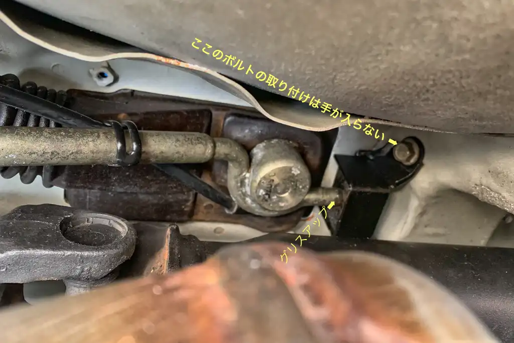車体の下からシフトジョイントのある部分を覗いてみると、届きそうもないところにある.