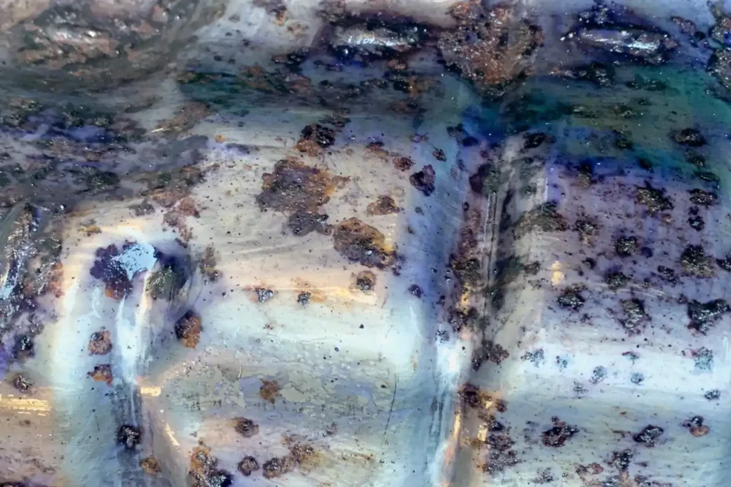 しばらくすると、赤いさびは黒色に変色していくが、さびのない反応しなかった部分は、白いままになった.