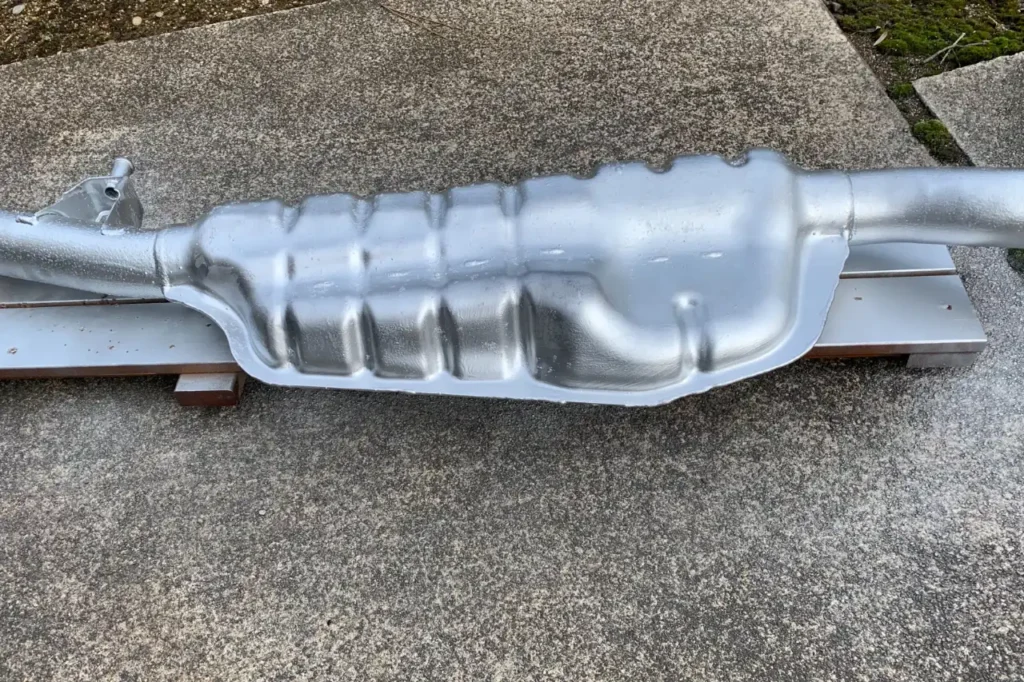 メッキの部分の塗布もダメと書かれていましたが、マフラーの中間の太鼓の部分にもさびチェンジを塗ってみました.