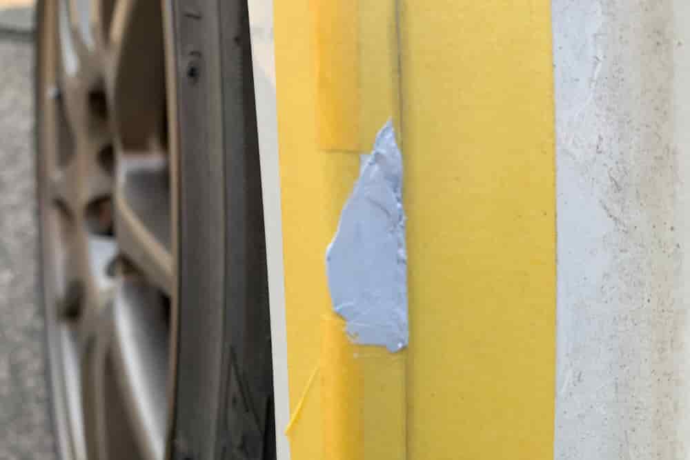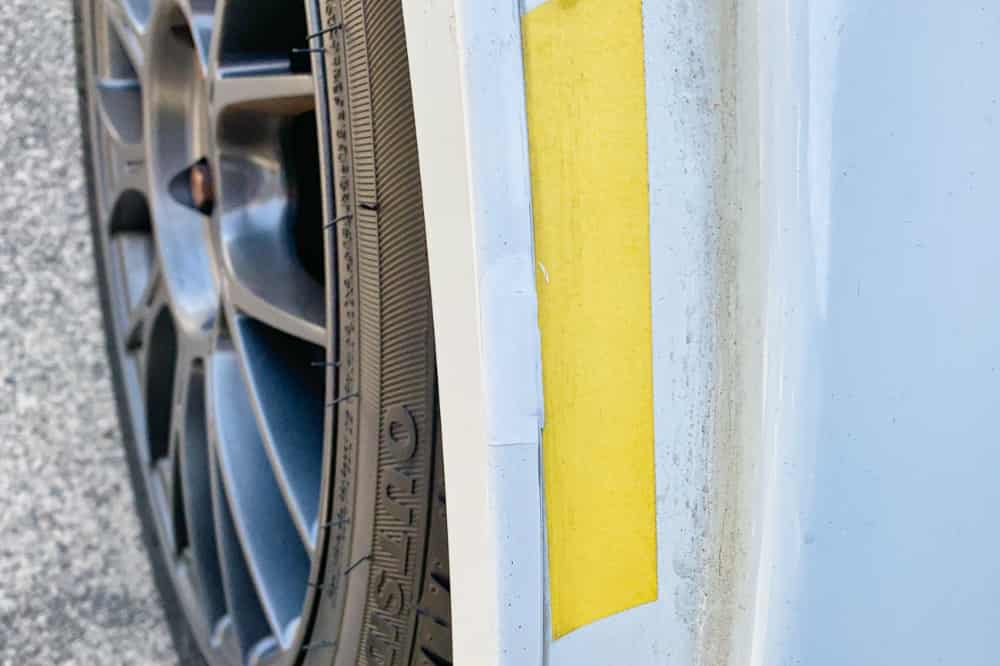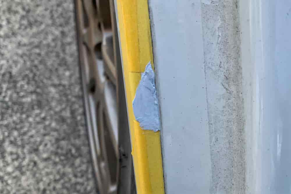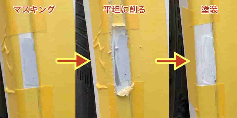 飛び出たパテを耐水ペーパーで平らに削るときに、ボディ側を痛める可能性は少なくなると考えて、補修部分をマスキングテープで囲った.